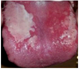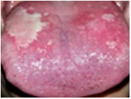 On intraoral examination, dorsum of tongue revealed irregular, raised, multiple bright red patches with areas of depapillation surrounded by erythematous zones (Figure 1).