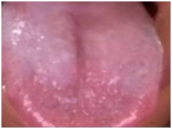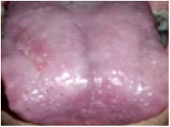 A 35 year old female, reported with a chief complaint of burning sensation accompanied by pain and discomfort on tongue while eating, followed by the peeling of tongue surface, with appearance of red lesion which was gradually worsening on the dorsal surface since five days. She gave history of intake of an antibiotic with the contents of Norfloxacin 400 mg + Tinidazole 600 mg + Lactic acid bacillus 120 x 106 spores for the treatment of stomach upset seven days ago. Gastrointestinal disturbances included muscle cramps followed by loose motions. The patient was on antibiotics twice daily for three days, lesions on the tongue started to appear a day after the consumption of the drug.